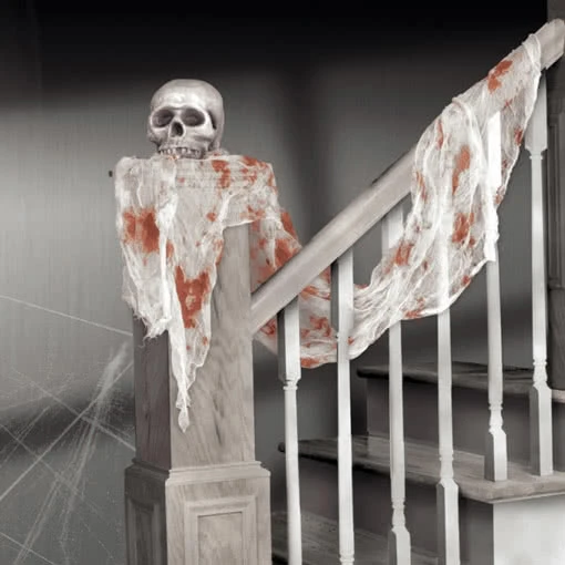 Das Leichentuch mit frischen Blutspuren sorgt für eine gruselige Stimmung. Der grobe Dekostoff mit Blutspritzern gehört zu jeder Halloween Raumausstattung, um gruselige Akzente zu setzen. An verschiedenste Stellen oder als Tischläufer drapiert, sorgt der Dekoschal an Treppengeländer, Fenster, Türen oder Möbeln Furcht einflößend dekoriert für die perfekte Gruselstimmung. Die Einsatzmöglichkeiten des blutigen Stoffs sind fast endlos und findet seinen Einsatz überall dort, wo eine gruselige Grundstimmung erzeugt werden soll zum Beispiel auf Gruselevents, Halloween und Mottopartys, in der Geisterbahn, Geisterschlössern, Film und Fotosets und Theaterkulissen.