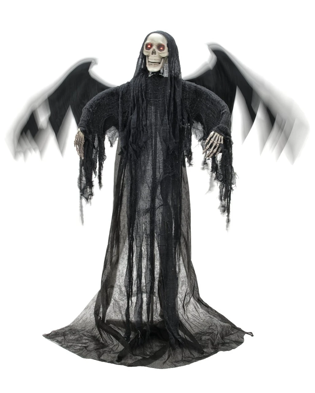 Du willst neue Maßstäbe in Sachen Halloween Dekoration setzen? Dann lade unseren schwarzen Pestengel mit Bewegung, Sound & Licht zu dir ein. Diese gruselige Deko Figur bringt selbst den stärksten Partygast zum Zittern. Mal sehen, wer sich als erstes ins Höschen macht, wenn der schaurige Skelett mit den Flügeln und dem Fetzenumhang mit den Flügeln schlägt und gruselige Laute von sich gibt. Seine Augen leuchten glutrot. Unheimlichere Geisterbahn Animatronics hat man selten gesehen.