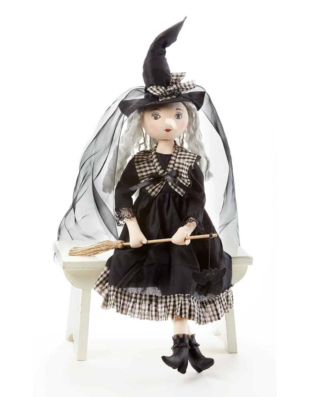 Niedliche Hexenpuppe mit Farmhaus Kleid als kinderfreundliche Halloween Deko