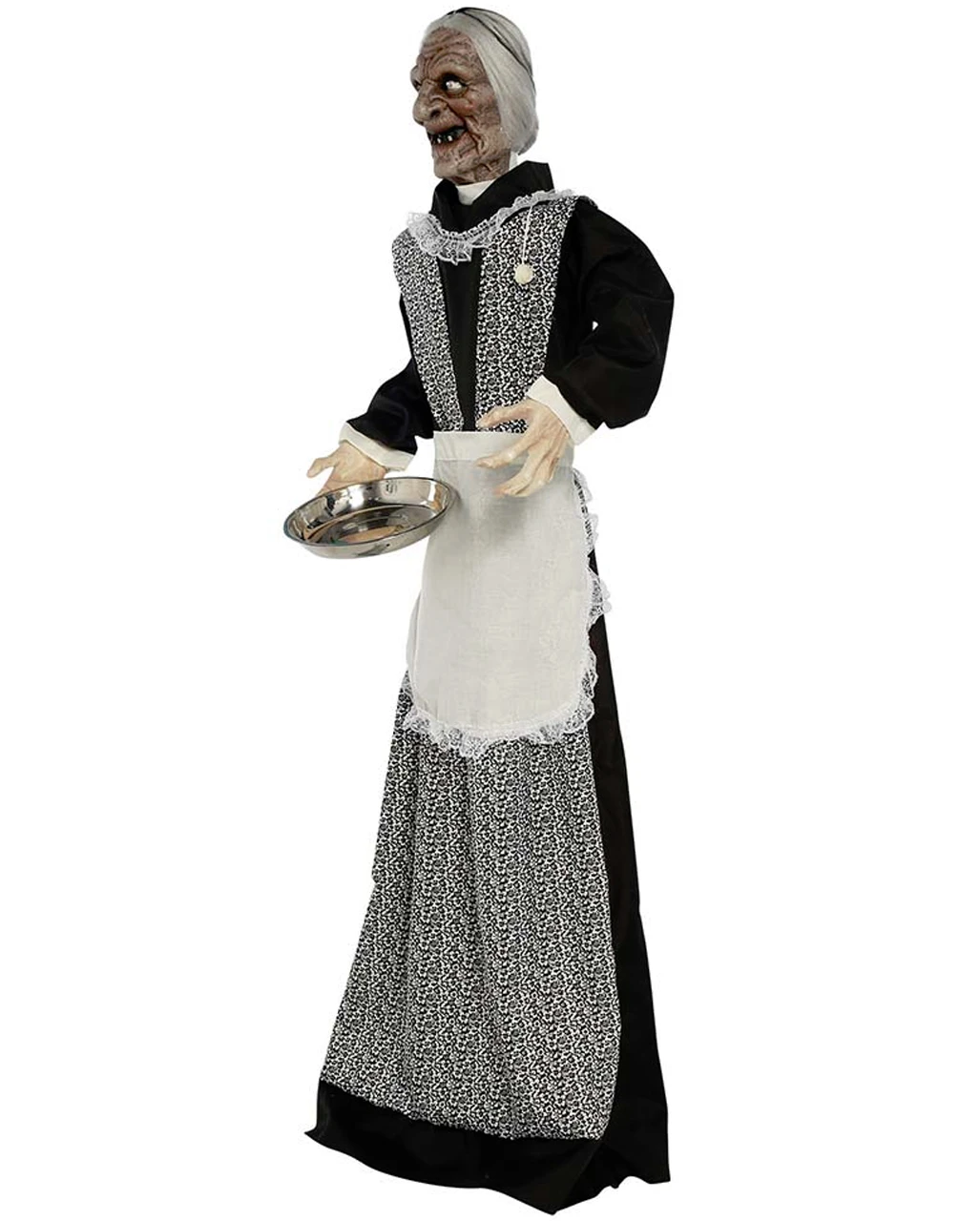 Das Zombie Dienstmädchen mit Bewegung, Licht & Sound wird dir eine große Hilfe sein. Ihr grausiger Zombie Kopf und ihr altmodisches Kleid mit Schürze, werden durch Batterien zum Leben erweckt. Der Kopf dreht sich, die Augen leuchten und sie gibt schaurige Laute von sich. Eben alles, was man sich von einer echten Zombie Magd nur wünschen kann. Die Figur wird durch laute Geräusche aktiviert.